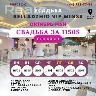 Идеальное место для вашей свадьбы. Также отлично подходит для дней рождений, юбилеев, корпоративов. Всё для комфортного отдыха рядом с Минском (500 метров от МКАД) - агроусадьба "Belladzhio VIP Minsk" с уютным домиком и сауной для маленьких компаний и просторным банкетным залом на 20-130 человек. Стильный интерьер, шикарная мебель, ухоженная территория с ландшафтным дизайном, прудом, водопадом и красивыми растениями. Вкусная кухня. Помощь в организации мероприятий.