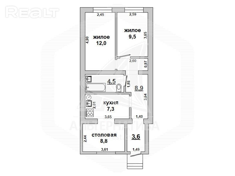 Квартира в блокированном жилом доме в г. Бресте. 1958 г. п. 1 этаж. Общ. СНБ - 54,6 кв. м, общ. - 54,6 кв. м, жил. - 21,5 кв. м, кух. - 7,3 кв. м. 2 комнаты, высота потолка - 2,7 м. Стены: материал - силикатный кирпич; отделка фасада - оштукатурен, окрашен. Кровля: шифер. Фундамент: ленточный сборный; материал - кирпич; подушка - песчано-гравийная. Коммуникации: отопление - газовый котел, газ - централизованный, водоснабжение - централизованный водопровод, электричество - централизованное, канализация - централизованная. Участок - 0,0191 га (9/50 доли от 0,1060 га). Всегда возможен торг - звоните! Готовы помочь для покупки этого объекта, Здесь можно - сегодня более 3000